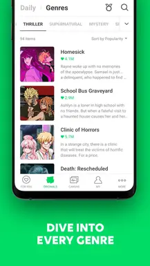 WEBTOONS’ dark neutral colors allow the illustrated thumbnails to stand out when users are scrolling through them.